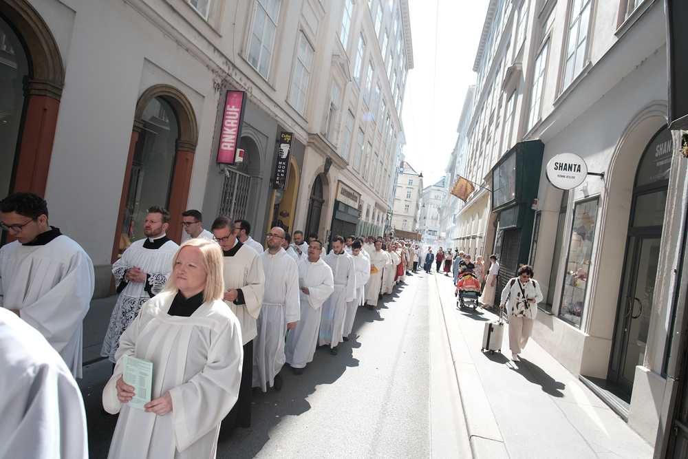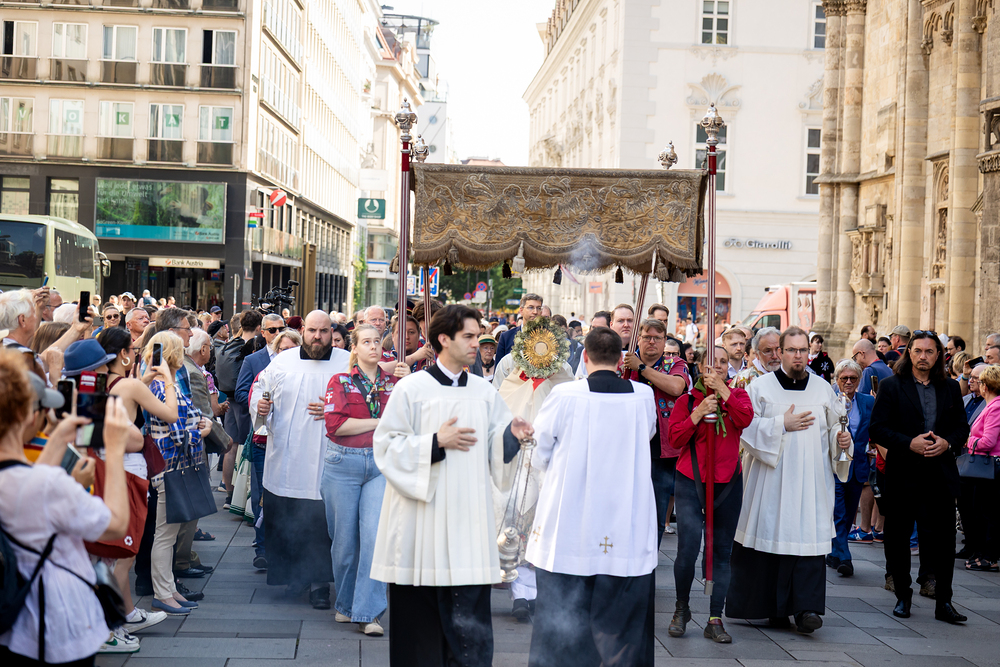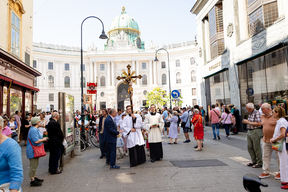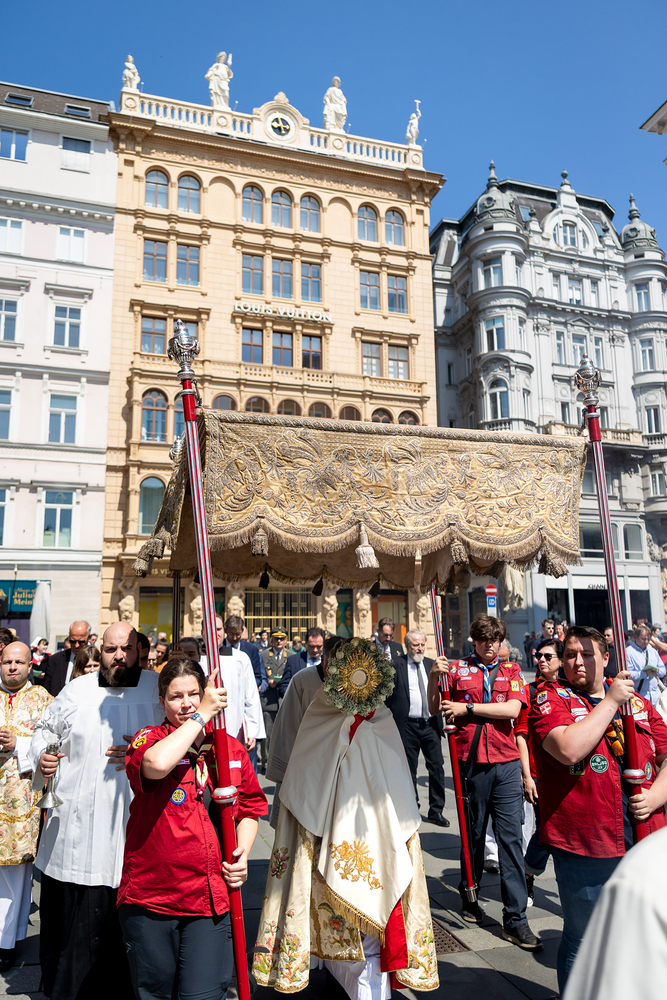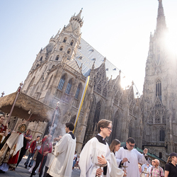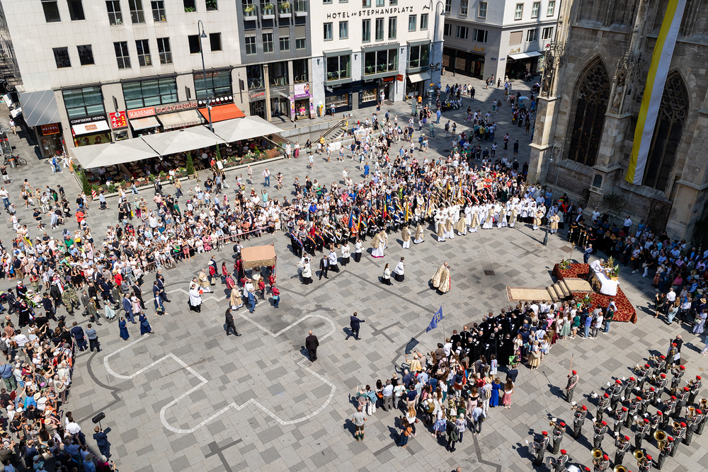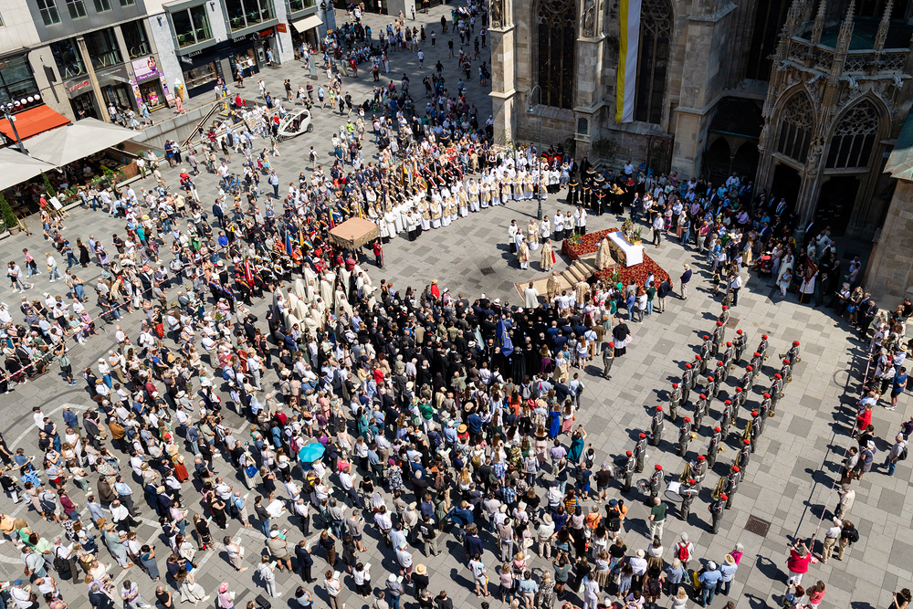 Josef Grünwidl betonte beim Stadtumzug anlässlich Fronleichnam die untrennbare Verbindung zwischen dem religiösen Feiertag und der christlichen Verantwortung, Gottes Schöpfung zu bewahren und eine „ökologische Umkehr“ angesichts der Klimakrise einzuleiten. Er dankte allen, die durch nachhaltiges Handeln und politischen Einsatz dazu beitragen, notwendige Maßnahmen zu ergreifen, um die dramatischen Folgen des Klimawandels abzuwenden. Die Fronleichnamsprozession, die vom Stephansdom ausging und Stationen am Michaelerplatz sowie am Graben bei der Peterskirche umfasste, zog erneut zahlreiche Gläubige und kirchliche Gruppierungen an. Auch politische Vertreter waren anwesend. Wir waren mit der Kamera dabei.